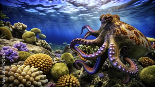 Vibrant Octopus in Coral Reef Habitat - Marine Life Photography