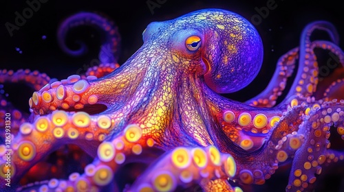 Vibrant octopus, ocean depths, glowing, digital art, marine life, poster