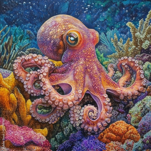 Vibrant octopus on a colorful coral reef.