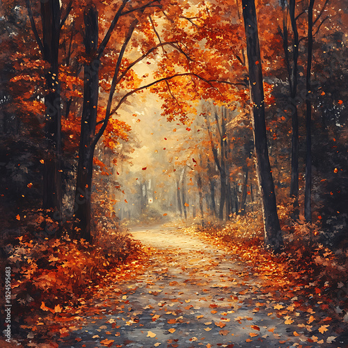 Vibrant orange and gold leaves blanketing a forest path, trees illuminated by soft sunlight, a calm breeze rustling the canopy, peaceful autumn retreat. Created Using: RED Komodo emulation,