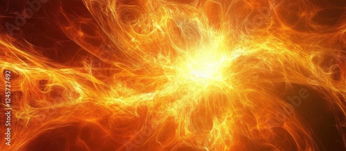 Vibrant orange and yellow swirls of energy radiate from a bright central core creating a dynamic and captivating abstract background design