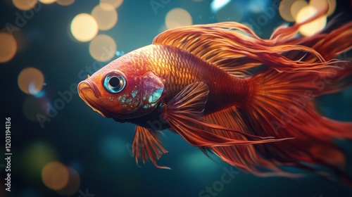 Vibrant orange betta fish with flowing fins, swimming against a bokeh background.