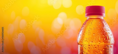 Vibrant orange beverage bottle with condensation against a colorful bokeh background, showcasing refreshing drink, copy space for text
