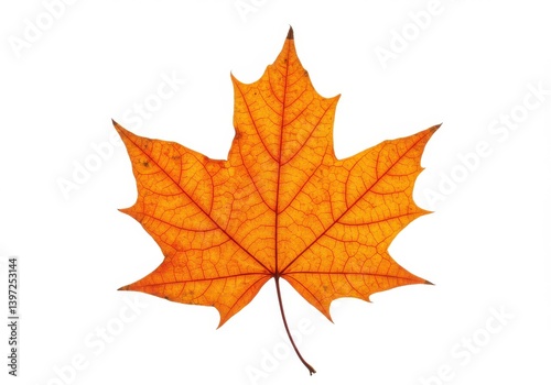 Vibrant orange maple leaf isolated on a white background showcasing intricate vein details vividly