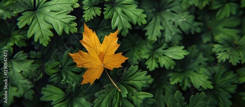 Vibrant orange maple leaf nestled among deep green foliage in a serene natural setting showcasing contrasting colors and textures.