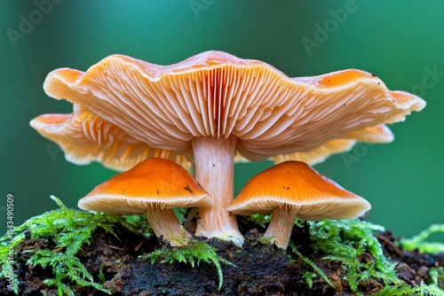 Vibrant orange mushrooms growing on moss, showcasing intricate gills and natural beauty in a serene environment.