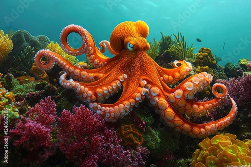 Vibrant orange octopus gracefully navigating through a colorful coral reef teeming with marine life in a serene underwater scene