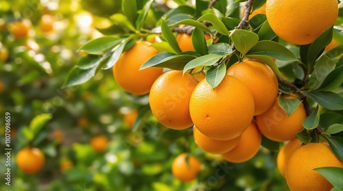vibrant oranges hanging from a tree branch in a lush garden, sunlit orange farm concept