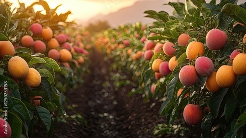 Vibrant orchard scene at sunset with ripe apples on trees and distant mountains in background