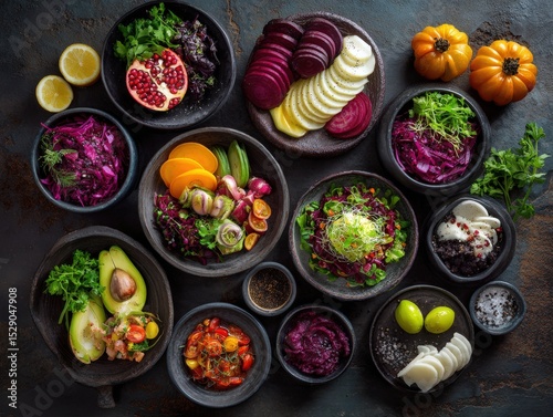 Vibrant overhead shot of various colorful vegan salads and vegetable dishes in rustic bowls. Perfect for blogs, cookbooks, and healthy food marketing. Ideal for websites, magazines, and social media.