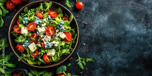 Vibrant overhead view of fresh vegetable salad with cherry tomatoes blue cheese and parmesan on a dark textured background ample space right