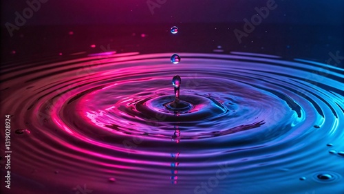 Vibrant pink and blue neon ripples expand from a water droplets impact, creating a mesmerizing, abstract artwork of fluid dynamics and color.