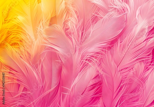 Vibrant pink and yellow gradient background with feather texture for a festive touch. The soft, fluffy feathers add an artistic feel to the design, creating a visually appealing and dynamic wallpaper