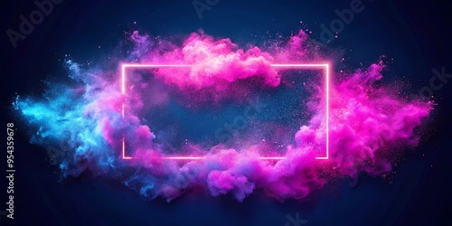 Vibrant pink neon powder explosion with glowing frame on blue background, creating a colorful cloud of dust like a paint holi celebration