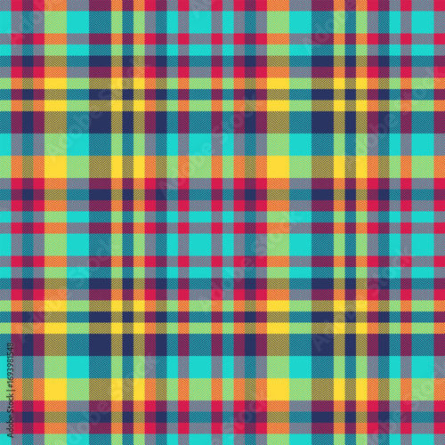 Vibrant plaid pattern featuring intersecting colorful lines forming squares. Versatile for backgrounds, textiles, or graphic design projects. Adds a touch of lively tradition.