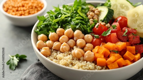 Vibrant Plant-based Protein Bowl with Quinoa, Chickpeas, and Fresh Vegetables for Nutritious Eating