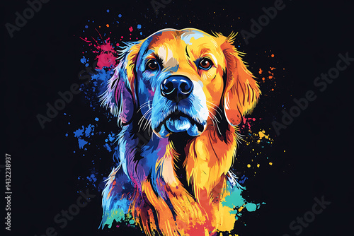 Vibrant portrait of a golden retriever with colorful splashes on a dark background