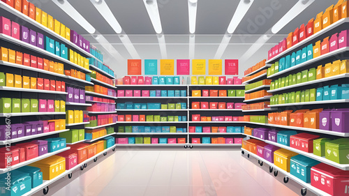 Vibrant product display shelves with colorful shopping carts, labels under spotlight, showcasing a variety of brands, organized and clean