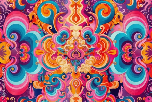 Vibrant psychedelic abstract design with swirling patterns in bright colors. Symmetrical composition featuring intricate curls, spirals, and organic shapes creating a mesmerizing, kaleidoscopic effect