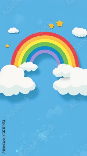 Vibrant rainbow arches across a clear blue sky, accompanied by fluffy white clouds and twinkling yellow stars, creating a cheerful and whimsical scene