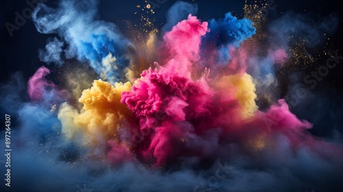 Vibrant rainbow color powder splash abstract explosion on white with blue and pink stains