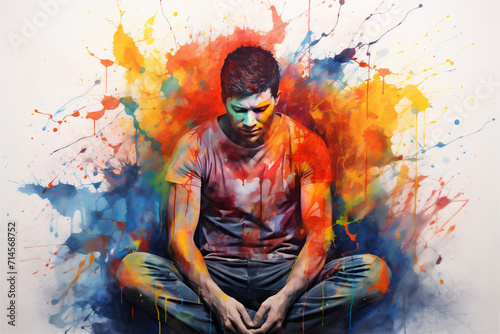 Vibrant Rainbow Colored Watercolor Painting, Man With negative Emotions, chaotic paint splatter around man representing bad thoughts, Generative AI