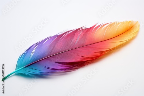 Vibrant rainbow feather, delicately resting on a pristine white surface, simple and elegant for Pride themes