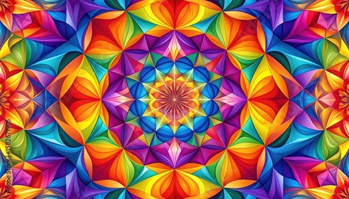 Vibrant rainbow geometric kaleidoscope pattern with 3D effects abstract symmetrical design