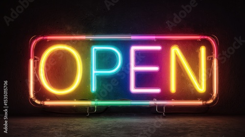 Vibrant Rainbow Neon Open Sign Glowing Brightly on Dark Wall Background