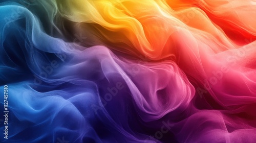 Vibrant rainbow-colored fabric swirls in a captivating display of color and texture. The sheer material creates a dreamy, ethereal mood.