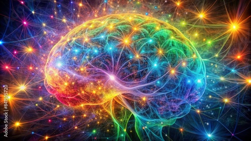 Vibrant rainbow-hued neural network resembling twinkling celestial map, with glowing fibrous connections inside a luminous, ethereal brain, pulsing with dynamic, swirling colors.