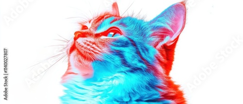 Vibrant Red and Blue Artistic Portrait of a Curious Cat Looking Up