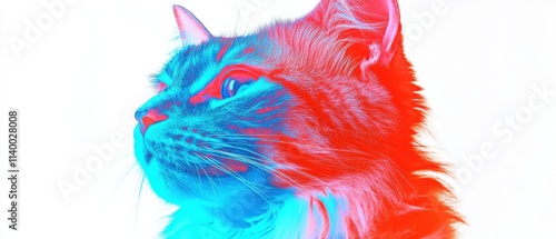 Vibrant Red and Blue Artistic Portrait of a Fluffy Cat