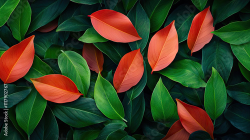 Vibrant red and green leaves create a stunning natural pattern on a dark background.