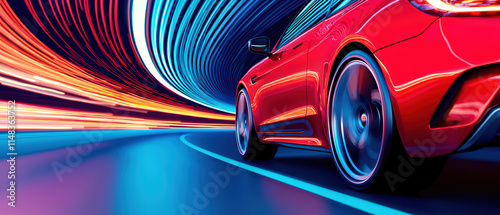 vibrant red car speeds through futuristic tunnel, showcasing dynamic light trails. motion evokes excitement and energy