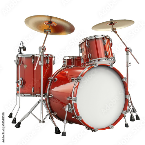 Vibrant red drum set with cymbals, perfect for music lovers and performers. Ideal for showcasing rhythm and energy in photography.