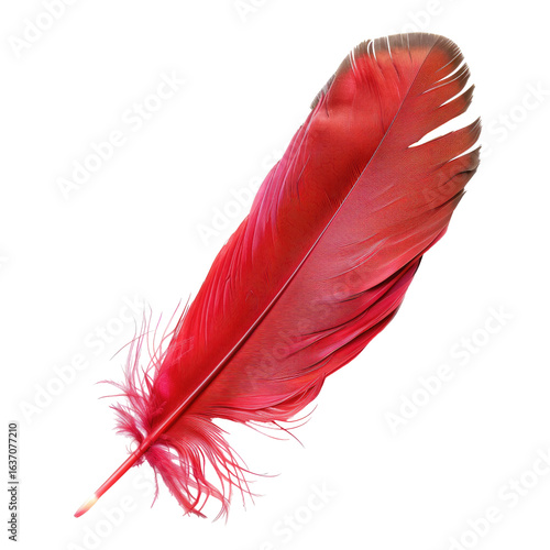 Vibrant red feather against black background. Detailed, graphic image of a single, stylized feather. Its bright crimson color is highlighted against a solid black backdrop.