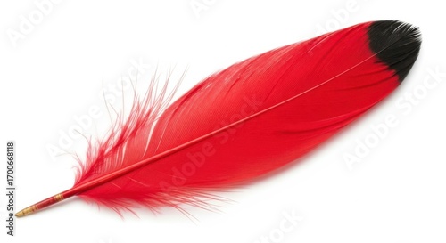 Vibrant red feather with a black tip isolated on for design and decoration