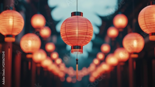 Vibrant red lanterns hanging in the streets creating a festive and enchanting atmosphere under the evening sky This traditional Asian evokes a warm cultural ambiance