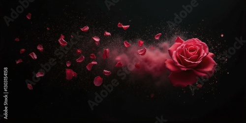 Vibrant Red Rose with Petals and Rose Dust on Black Contrast Background
