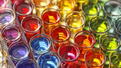 Vibrant Reflection of Colorful Cocktail Glasses on a Bar Counter