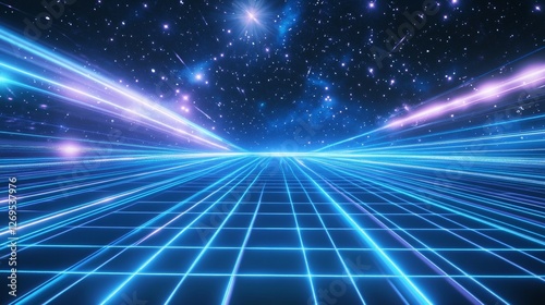 Vibrant retro 80s video game aesthetic with blue light grid over starry space background