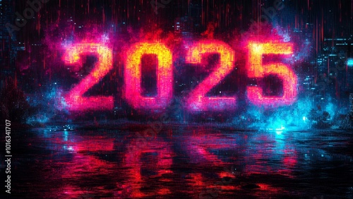 Vibrant retro pixel art of 2025 set in a colorful digital landscape