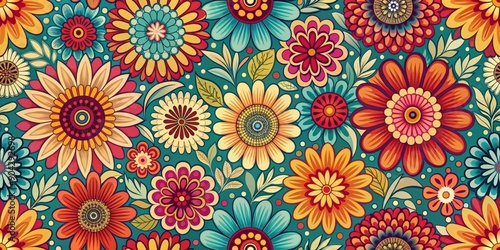 Vibrant retro-style seamless pattern featuring bold, stylized flowers in trendy colors, creating a unique and eye-catching floral texture for various design applications.