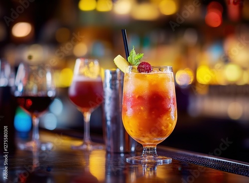 Vibrant row of refreshing fruit and vegetable drinks lined up on a stylish bar counter.