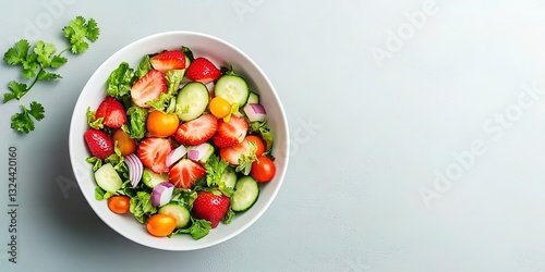 Vibrant salad with colorful vegetables in a white bowl on a grey background, in a flat lay style. A