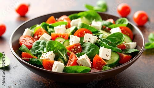 Vibrant salad with fresh spinach feta cheese cucumbers and tomatoes