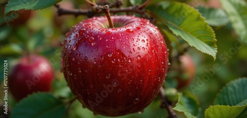 Vibrant Scarlet Apple with Water Droplets, Close up View, Set Against a Background of Green Leaves.