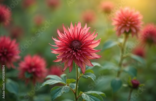 Vibrant scarlet beebalm flower, bergamot, or squaw blooms in sunlight. Red petals, green leaves. Ideal for botany, garden design, floral, natural beauty projects.