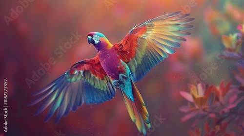 Vibrant Scarlet Macaw in Flight with Spread Wings Against a Blurred Background of Colorful Foliage